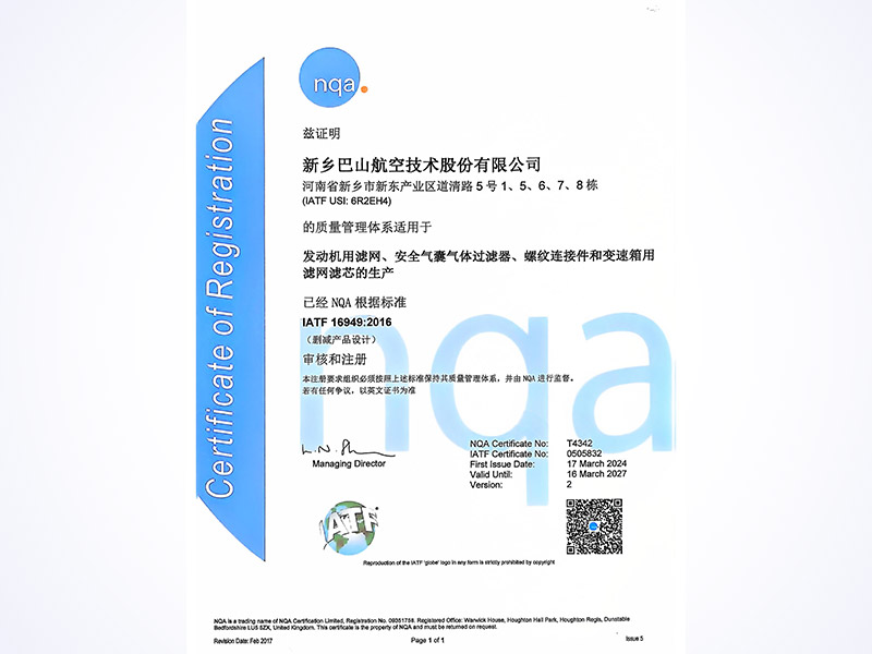 作为国防工业系统内的专业化生产商,巴山公司深耕金属丝、金属网、钢丝螺套、特种滤芯滤器、飞机尾翼除冰加温元件及电源产品研发制造。产品深度融入航空航天、国防军工全链条,广泛应用于飞机、飞船、火箭、导弹等尖端装备,为国家国防事业筑牢基石。同时,公司以技术优势辐射多领域,为航天、电子、核工业、新能源、汽车、环保等行业提供过滤、筛分、 屏蔽及紧固连接的一体化解决方案,推动产业技术升级。在质量与管理体系建设上,公司已通过ISO9001/GB/T19001/GJB9001C军民质量管理体系、IATF16949汽车行业质量体系ISO14001环境管理体系及IS045001职业健康安全管理体系认证,以标准化运营保障产品卓越性能。公司检测试验设备齐全检测能力行业领先,配备有激光测径仪、丝网测径仪、螺纹检测仪、光谱仪、碳硫分析仪、强度试验台、流阻试验台、污染度等级在线清洗试验台等高精度检测试验设备。