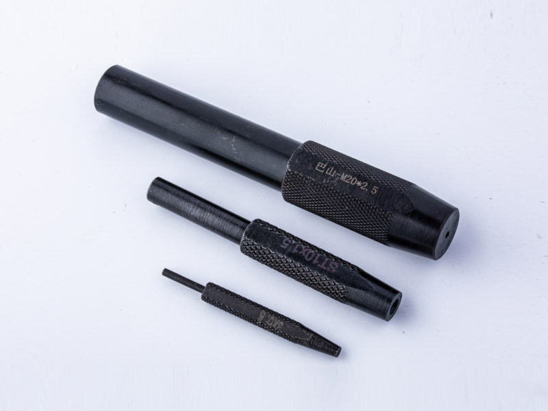 对于通孔,需将安装柄折断,通常将冲断器对准安装柄,用约 200 克榔头垂直猛击即可将其去除。对于 M18×2.5 以上粗牙螺套和 M14×1.25 以上细牙螺套,也可用尖嘴钳上下弯曲安装柄使其从预切口处折断。